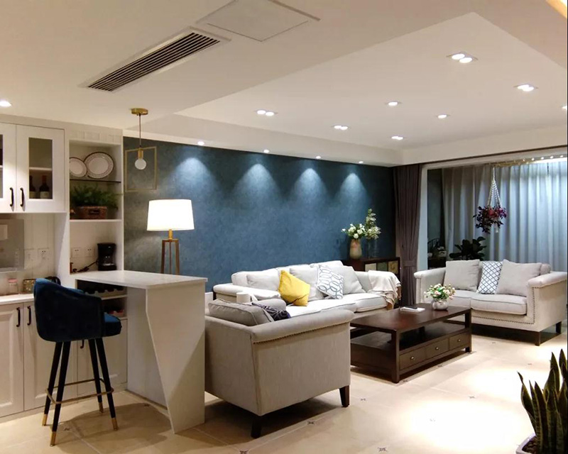 有獨立入戶區的戶型,把吧臺設計在不靠墻的沙發背后,客廳的隱私感更足。