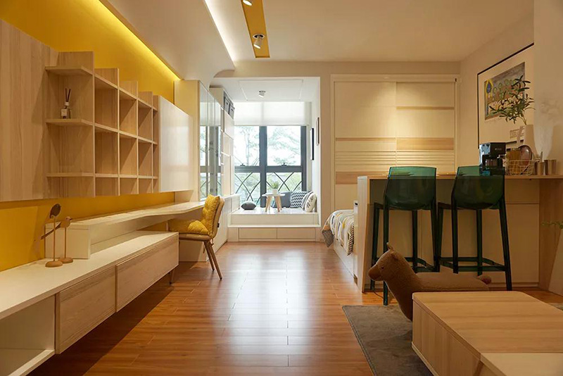 若是沒有明顯墻體區分的單身公寓,以輕量的吧臺做隔斷,還能充當餐桌功能,一臺多用,方便至極。