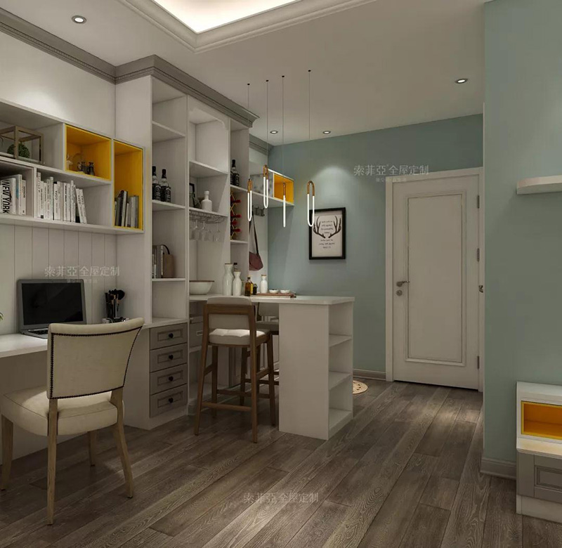 既可以做茶水區,又可以充當簡餐區,作為臨時工作區也綽綽有余,輕量不占地的吧臺隔斷設計,對小戶型、追求生活情調的朋友,可謂十分友好。