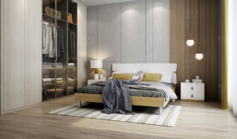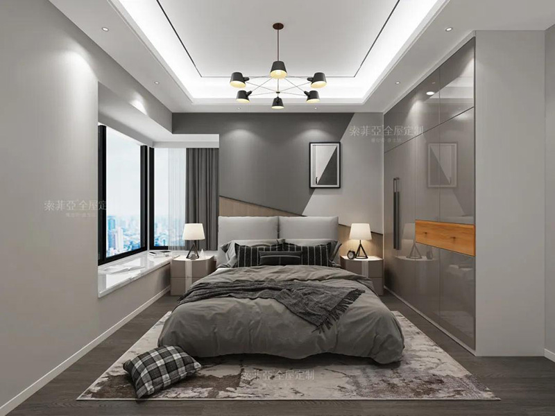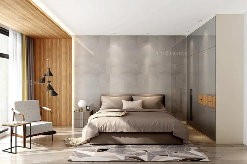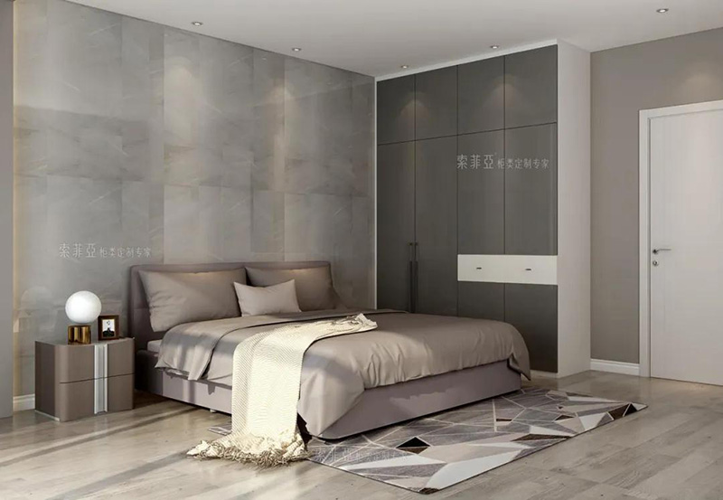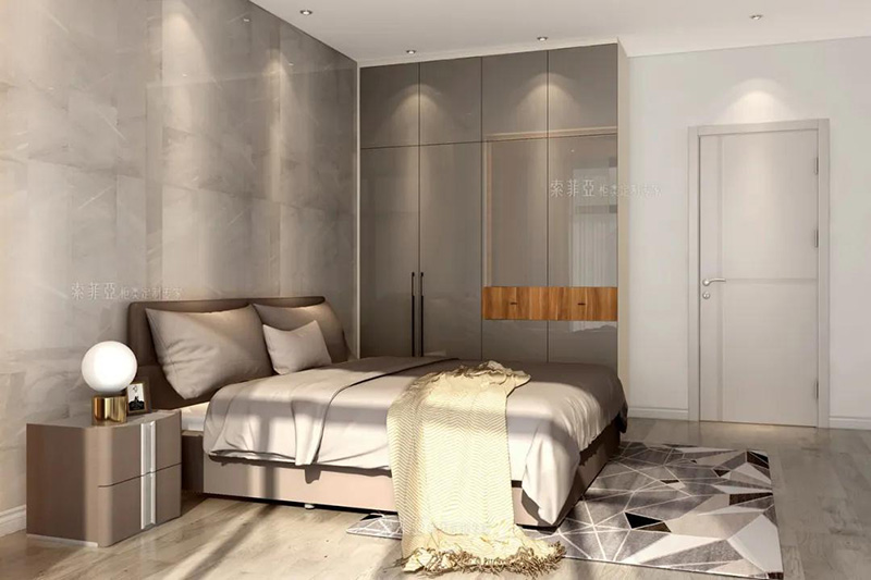 假如臥室風格整體偏現代,覺得大面積白色衣櫃太單調,可以選擇楓木色色塊或是灰色色塊點綴,增添活力感。