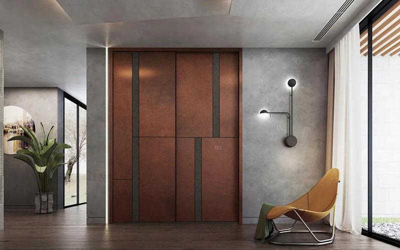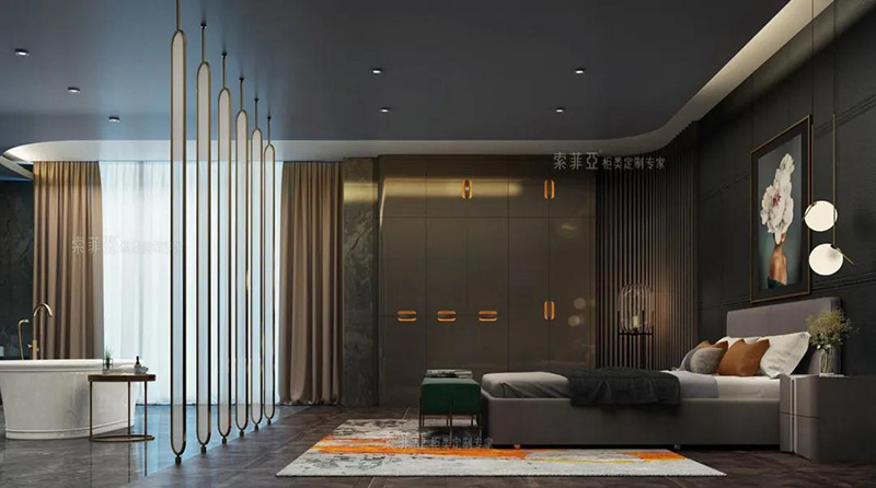 爵士紅銅色的衣櫃完美還原古銅質感,肌理清晰立體,搭配線形拉手,高挑簡約,讓整個臥室空間有極強的個人色彩。