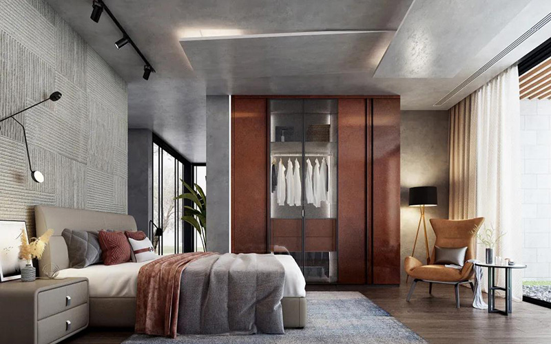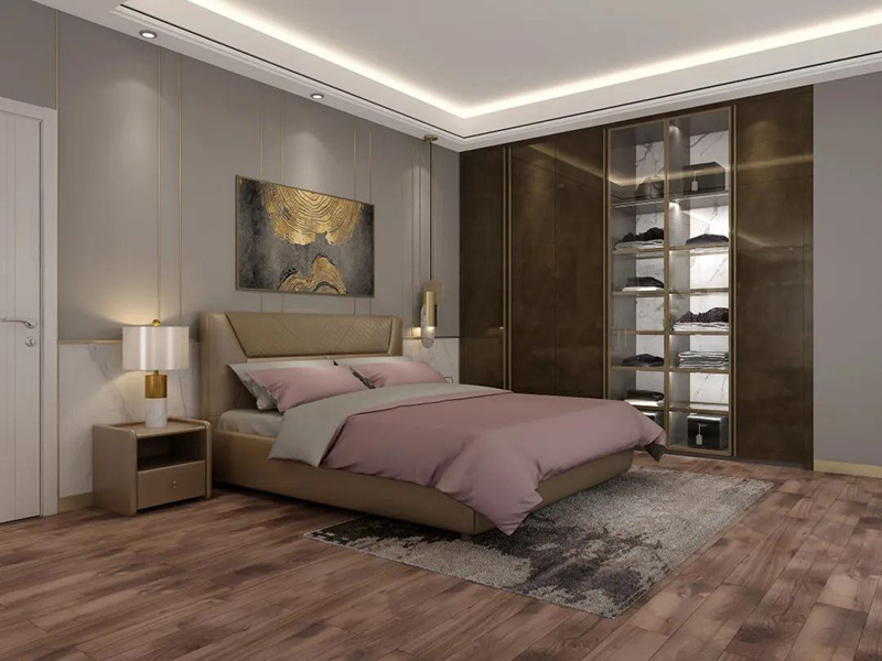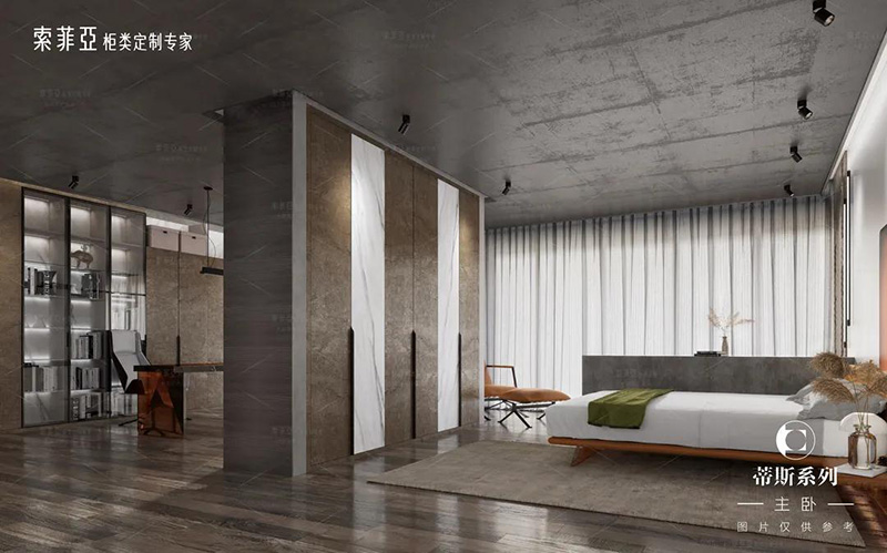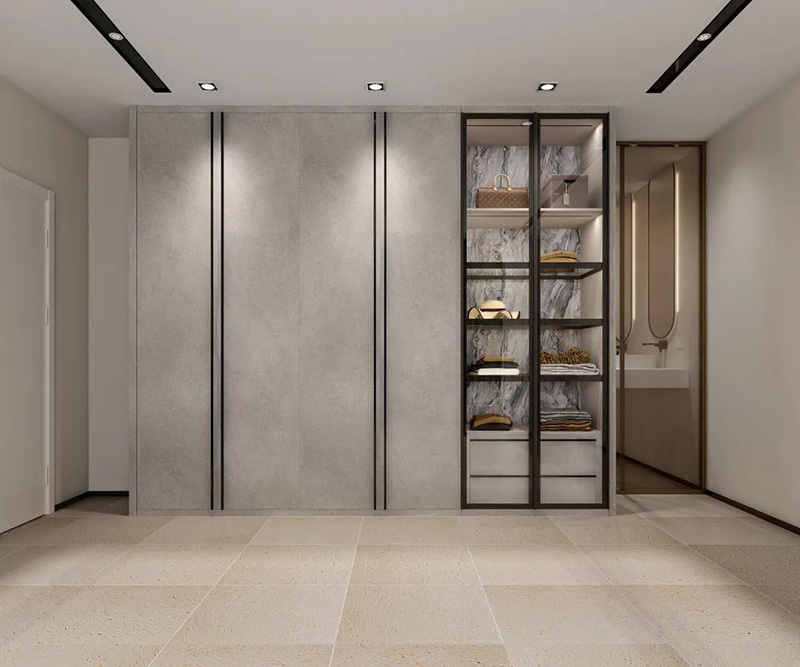 一門到頂的衣櫃,搭配上高光烤漆、巖板等新興材質櫃門,打造出現代輕奢的獨特視感,低調奢華,又熠熠生輝。