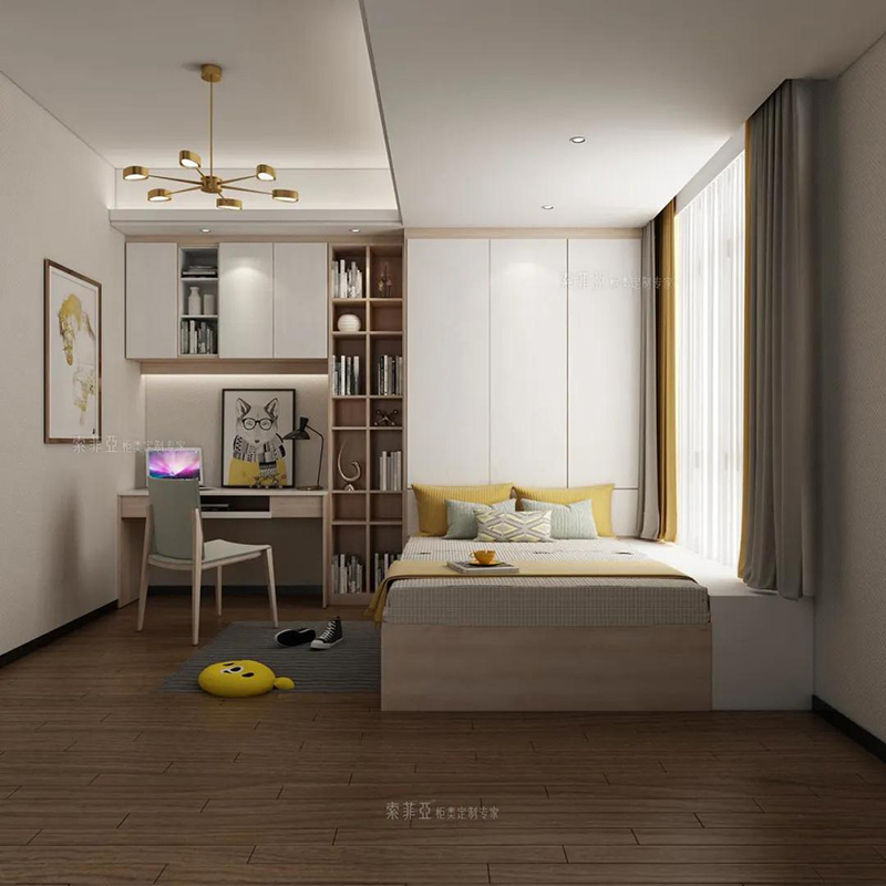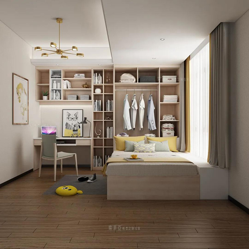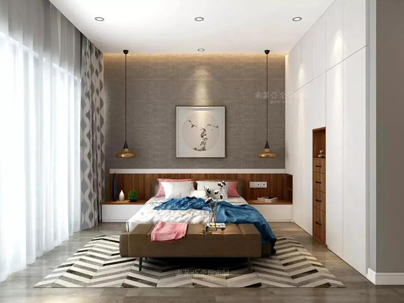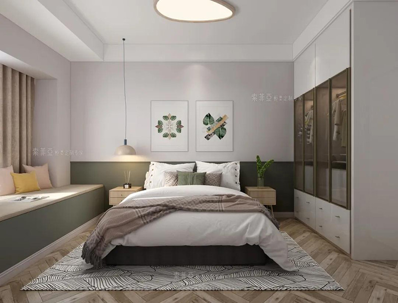 臥室衣櫃+床頭櫃的組合,讓原本利用率有限的床頭位置和墻面空間都得以充分利用。