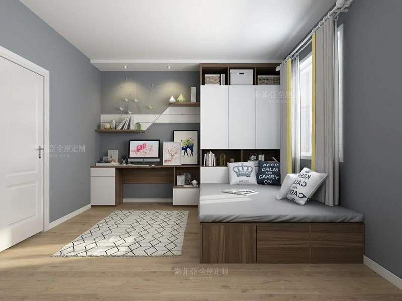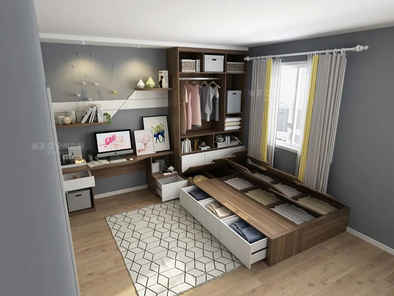 床下除了骨架外全都做成儲物區,相當于多了一個橫放衣櫃那么大的收納空間,臥室衣物再多也不怕沒地兒放。