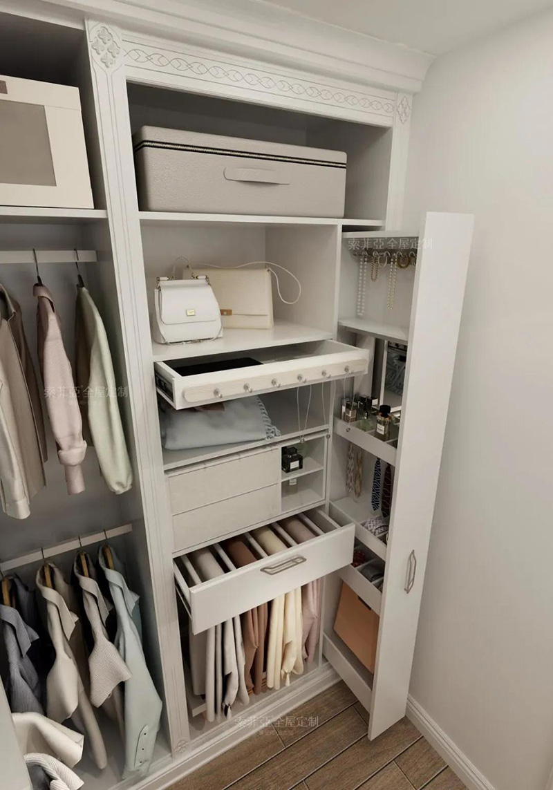 方便收納首飾、香水等日常小物的收納窄櫃;方便實用的褲子架;超高空間利用率的雙層掛桿。