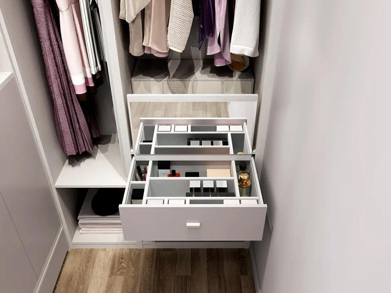 抽屜多少合適呢?老居認為,越多越好。衣櫃內的抽屜設計不起眼卻很實用,可幫助衣櫃儲藏更多“需要隱形”的物品。例如背心、薄T恤、貼身衣物、領帶、腰帶、絲巾等等。