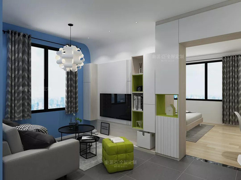 利用電視櫃進行隔斷,比額外砌墻要實用得多。電視櫃不僅能充當隔斷,還能額外提供更多功能。