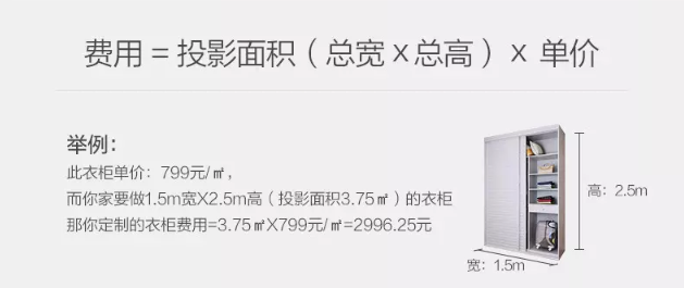 小編在網絡渠道上,包括維意客製化家具官網商城上也沒有找到一種確切的客製化衣櫃計算價格公示。據了解,維意客製化也是有按投影面積計算和展開面積計算,這兩種客製化衣櫃計價模式也是客製化家具行業中常常使用的。