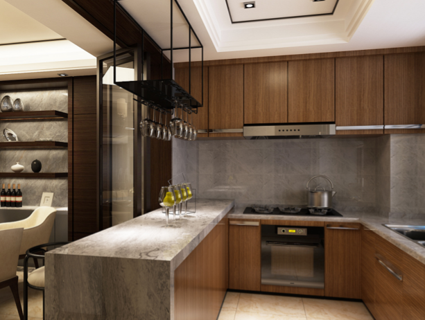 如果廚房空間較小的話則不適合選深色,小空間里的深色會給人壓迫壓抑之感,此時白色或乳白色是比較好的選擇,但這兩種顏色的最大問題是比較容易臟,這不適合懶人,如果你比較勤快那就選這兩種。另外銀灰色也比較適合空間不大的廚房,同時也可將邊角搭配上有顏色的條框。總之,整體上的櫥櫃顏色選擇要和地板、吊頂來搭配。小空間廚房墻面盡量選用白色的瓷磚。另外要特別注意不要使用有立體感的圖案,或是明暗對比強烈的裝飾材料,這不僅會使廚房面積在視覺上顯得狹小,而且容易使人產生高低不平、凹凸不平的錯覺。