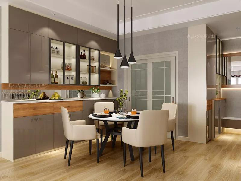 餐廳部分,沿墻體設計成一整面櫃體,功能為餐邊櫃及儲物櫃,分上下兩部分,中間留出置物空腔,空腔內壁貼上了玻璃,形成一種虛實結合的整體式設計。