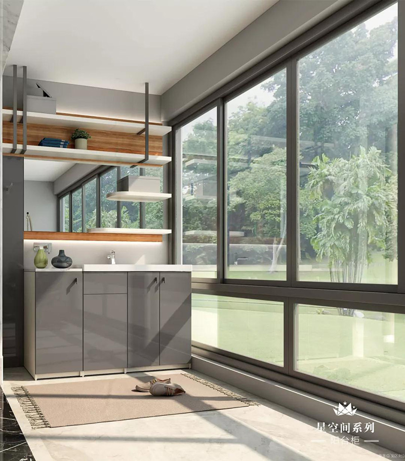 陽臺整體窗戶置換為通透的大玻璃面窗,在西側設計成洗漱區,對于只有一個衛生間的@Alex家來說,可以減緩衛生間使用壓力。