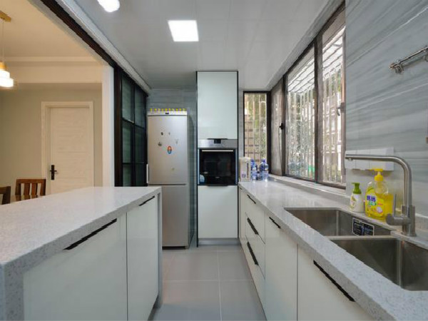 二字型櫥櫃就是將廚房分為兩個功能區:清理臺和料理臺。清理臺用于清洗和處理做菜做飯的材料,料理臺則是用來烹飪食物的地方。二字型櫥櫃呈“二”字布置,分工明確,在做菜的過程中,只需轉個身就可以輕松拿取想要的食材,十分地便利。