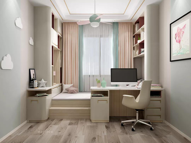 進門處的通頂衣櫃運用收放設計,小時候不僅能放玩具模型,長大了還能放包包和飾品,簡直滿足了小姑娘8到28歲的需求。