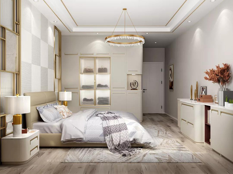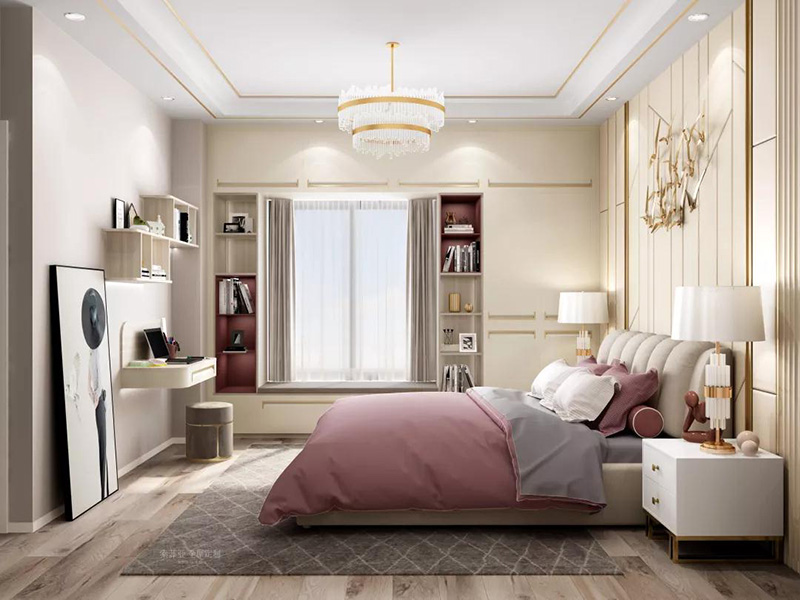 主臥是按照@Lam妻子的喜好設計,月牙白基調,粉色點綴,背景簡單線條勾勒,軟包床頭非常實用。