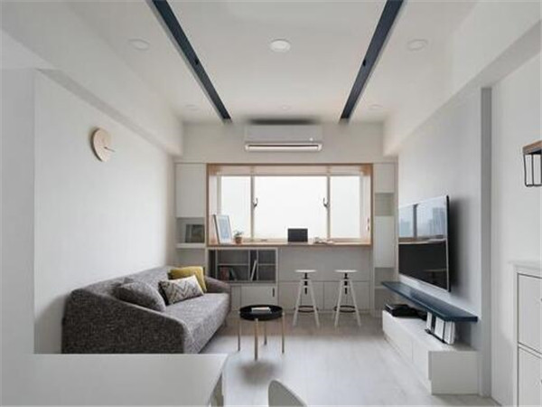 客廳的面積也非常小,因此跟餐廳之間就沒有設計隔斷,這樣整體的採光也會好一些,顯得室內很通透。在窗戶邊還做了一個簡易吧臺,還能當做工作桌使用,很方便。