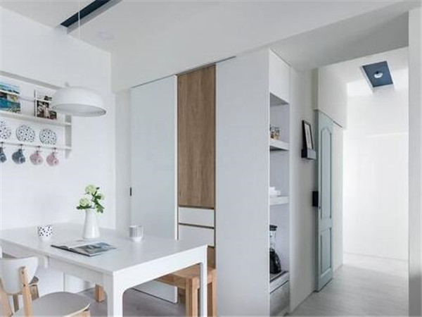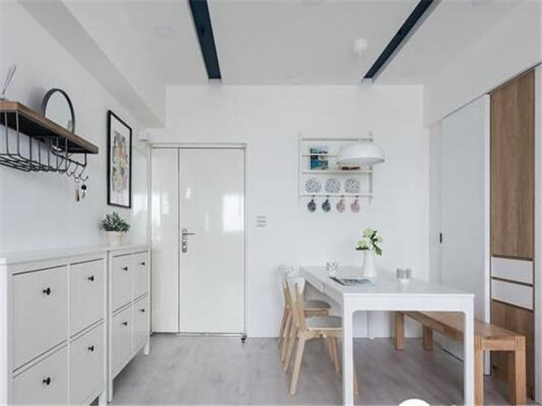 白色的墻面和吊頂,以及白色的鞋櫃和餐桌,入眼皆是白色,這樣也顯得干凈整齊,搭配了一些木質和黑色的點綴,倒也不顯得整體單調。