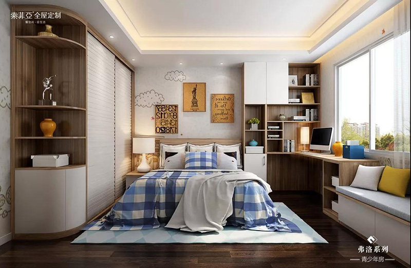 次臥作為兒童房,同樣以低明度的胡桃木色為主色調,點綴姜黃、海藍,營造活潑又不失溫馨的氛圍。衣櫃、書桌、書櫃一體設計,留下更多空間給孩子活動學習。