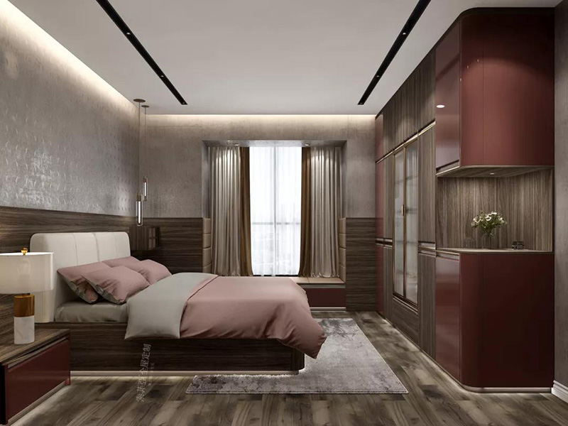 簡潔的木飾面床頭墻與粉色四件套形成強烈對比,展現了主人獨屬于自己的生活態度。