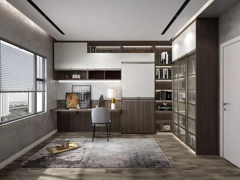 @vivide夫婦的父母都住在不遠處,故書房僅打造了一整排L形櫃,搭配通透的波浪亞克力造型櫃門,顯得非常大氣。