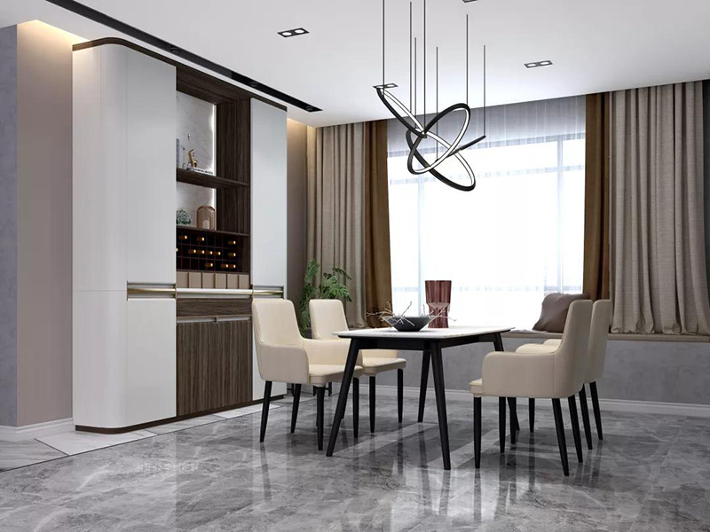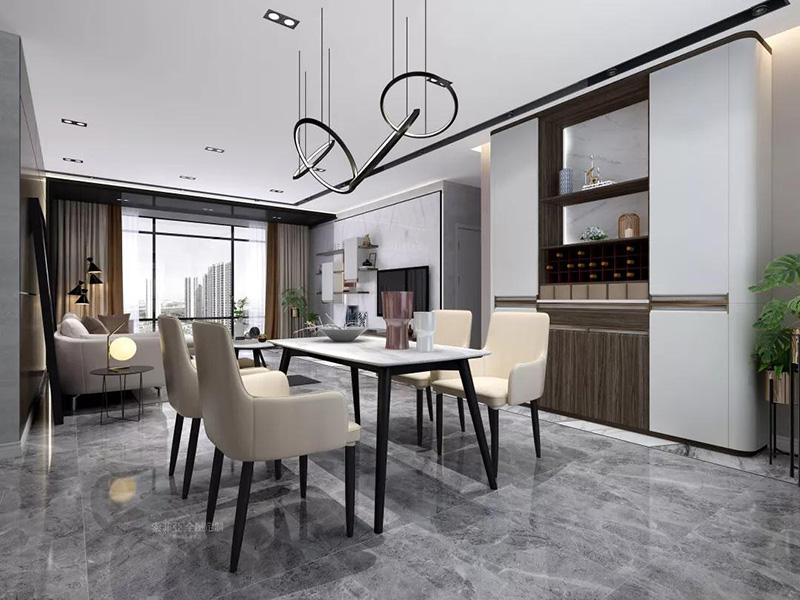 @vivide家戶型是客餐廳一體設計,為了空間不顯得凌亂,餐廳選用了細腿的餐桌椅,旁邊是整墻式餐邊櫃,整體線條溫潤流暢。