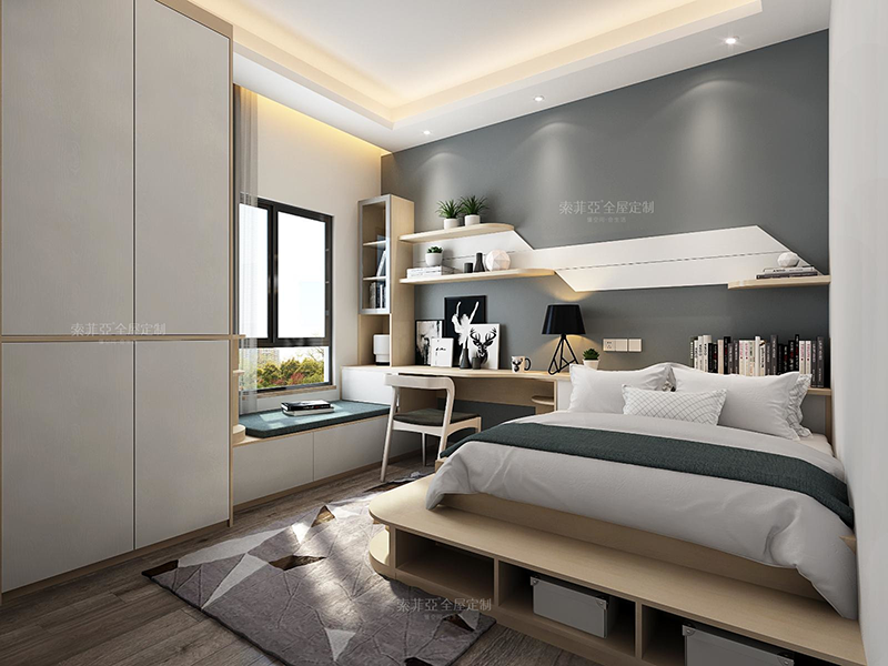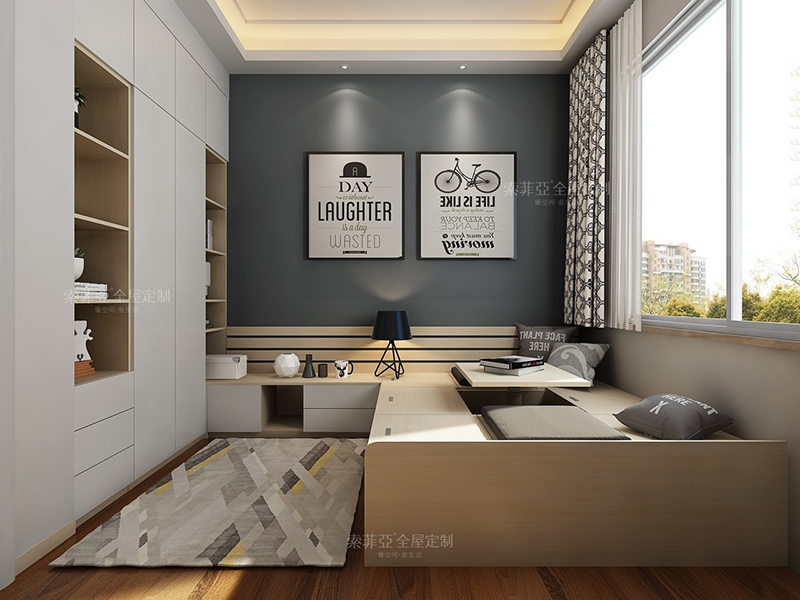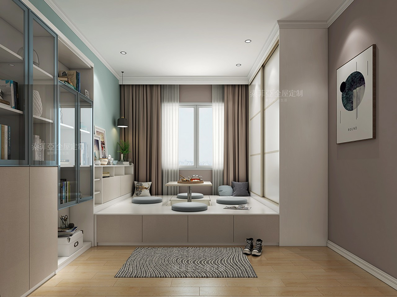 榻榻米、書櫃、衣櫃一體化設計,整體布局一氣呵成。右邊到頂式衣櫃方便衣物的收納,而左邊則是書櫃,榻榻米可供休閑娛樂和客臥休息,一房多用。