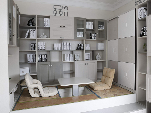 榻榻米占地面積比較少,一般只占用窗戶邊及角落處,作為一個房間的裝飾家具。一般放在書房的榻榻米,都能很好的利用書房有效空間。我們都知道,書房面積比較小,可用空間也不多,放了一張書桌椅子和書架,基本就滿當當的。