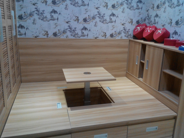 這種安裝升降機的房間能真正將我們的房間一房多用,集收納,娛樂,學習,休息為一體。將升降桌升起,房間就可以做書房,茶室,接待朋友打牌、聊天等,將升降桌降下,就可以做兒童的休閑室,不擔心會發生磕碰,或鋪一床薄被又可以做客房。