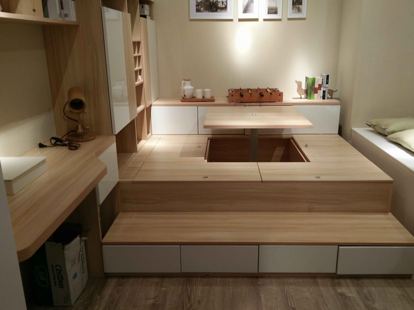 升降桌的升降設計使得室內沒有其它復雜的家具或夸張的飾物,整體裝潢風格簡潔大方;還使居室在原有建筑面積上較大限度地拓展室內空間;榻榻米地臺做成多個格子空間或抽屜形式來儲物,也有效節省了空間。