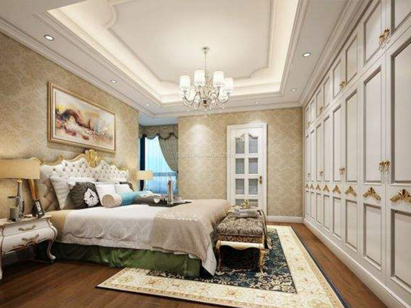 歐式臥室頂部喜換歡用大型燈池,並用華麗的枝形吊燈營造氣氛。門窗上半部多做成圓弧形,並用帶有花紋的石膏線勾邊,給人以大氣、豪華、奢侈的感覺,歐式風格的臥室強調以華麗的裝飾、濃烈的色彩、精美的造型達到雍容華貴的裝飾效果。