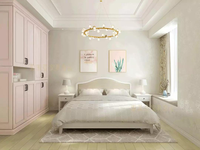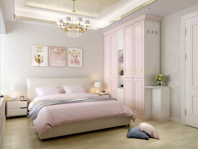 馬卡布藝床自帶清新文藝氣息,暖杏配色,簡單又溫暖,與原木色地板相互映襯,調和粉白色衣櫃和粉色床品的甜美感,營造出一個以原木色為主、粉色為輔的軟糯臥室。