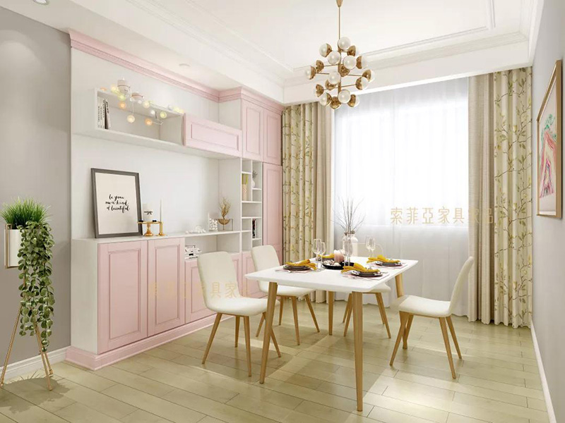 粉白相間的櫃子,雅致清新。因為有大面積原木色地板作為空間底色,所以粉色並沒有讓餐廳變得很甜膩。而且,餐邊櫃的粉色與布藝沙發色調相呼應,保持了客餐廳配色的一致性~營造出柔美溫雅的感覺。