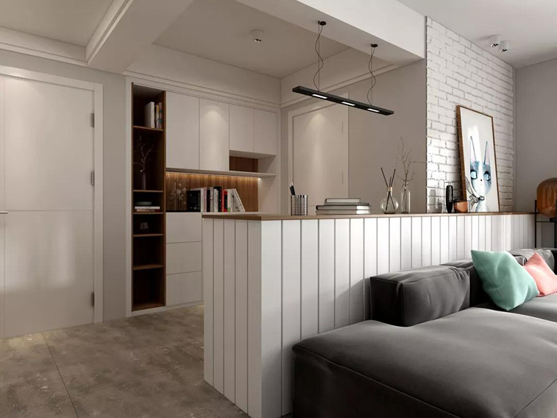 另外還用一個矮櫃將入戶與客廳隔開,在客廳和外界之間營造了一個過渡空間。