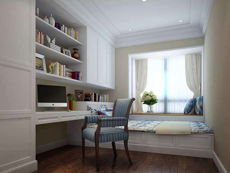 還有一種“L”型的設計是把書桌和櫃子設計在同一個方向,書桌和櫃子的寬度是相等的,這樣在視覺上會覺得很整齊。這樣一般榻榻米就會緊貼著門口的墻,私密性會降低一些。可以把櫃子和書桌的部分直接打成一個組合櫃,這樣書桌的上部空間還可以設計成櫃子,用來做收納。