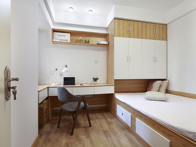 第3種就是隔斷式的榻榻米設計。這比較適合空間稍微大一點的房間,在安裝了榻榻米之后,在榻榻米的側面,就是上下床的地方安裝一個書桌,把書桌作為休息和工作之間的分割。這樣的分割方式就是在原本的房間里再隔斷出一個小的空間,會比較私密。適合自己安靜地想事情或者是工作。