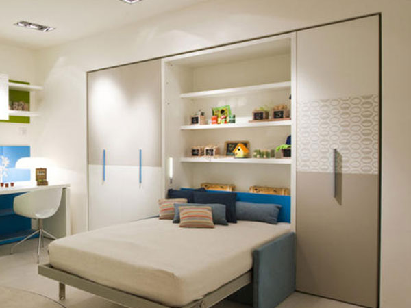 從顏色上來說,一般冷色調的家具更具有視覺上的延展性,因此,小臥室盡量避免選擇暖色調家具。此外,可以在市場是選擇一些專門針對小臥室的家具。床上用品最好也選擇簡潔明快的顏色,避免選擇過于繁復的圖案,這樣在整體搭配上更能給人一種清爽感。