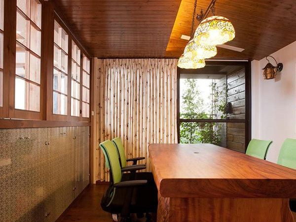 原木色的椅子,給人一種淳樸、典雅的氣質。屋中心老舊的鐵皮吊燈,也是一筆亮點。