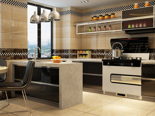 1、實地測量時,根據煤氣管道做好灶具的規劃,米箱、水槽、碗櫃、消毒櫃等的尺寸和水管、電路的分布設計,一般會根據洗菜、切菜、做菜、裝菜這樣的做飯流程設計