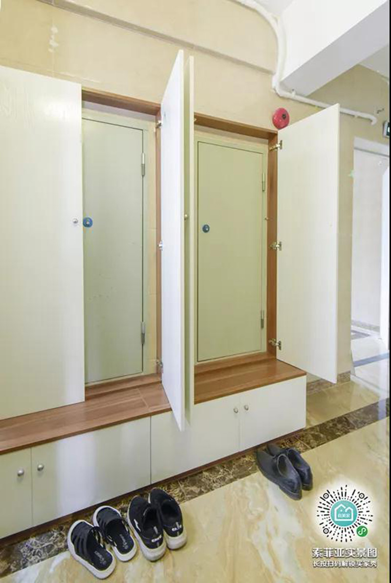 轉角的入戶櫃,卡座的容納人數大大增加,早上出門不用分批穿鞋,一家人一起換鞋都沒問題。