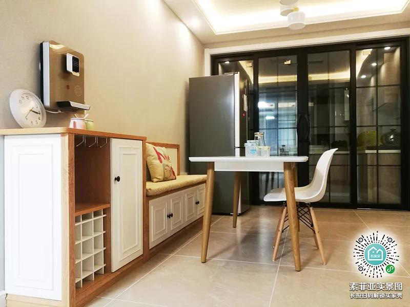 進門就是餐廳的戶型,把卡座打造成隔斷櫃,靠門邊的一面用來收納鞋子,靠餐廳的一邊當座位,這樣的區域分隔,美觀又實用。