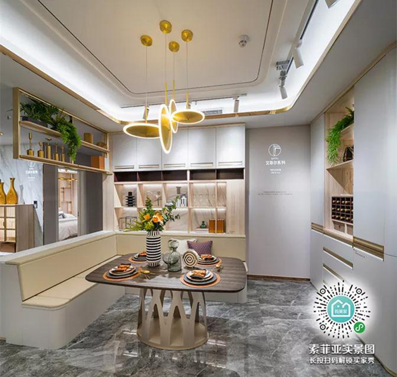 餐邊櫃+卡座,繞著墻貼邊的設計,一面墻是卡座,一面墻是餐邊櫃,這樣即可以收納更多物品,而且真的可以坐很多人。