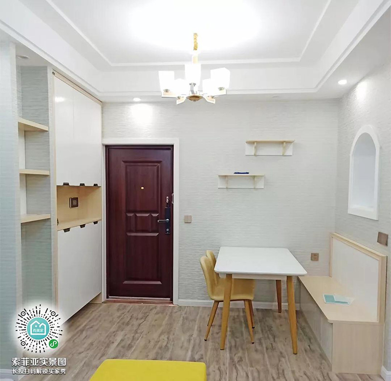 進門正對著客廳,做一個卡座隔斷入戶櫃,這樣可以實現空間共用還分化出了不同的區域。