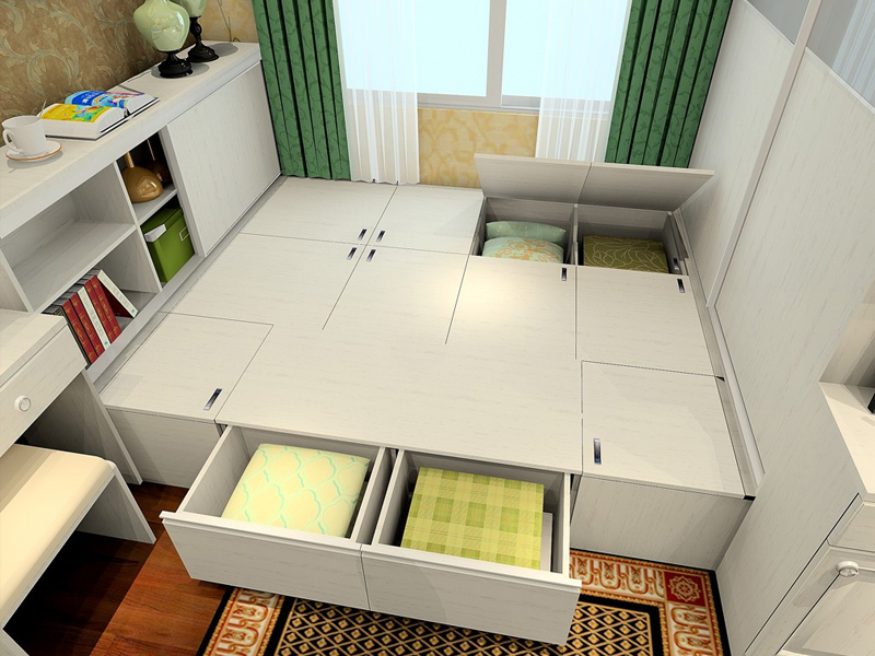 榻榻米不僅有著不俗的外觀特色,其內部也就是床下方也是有著強大的儲物功能。一般都是設計儲物櫃,用來收納一些不常用的東西;當然也可以將其設計成桌子床、椅子、沙發等家具,這樣可以避免家具的多余堆放。