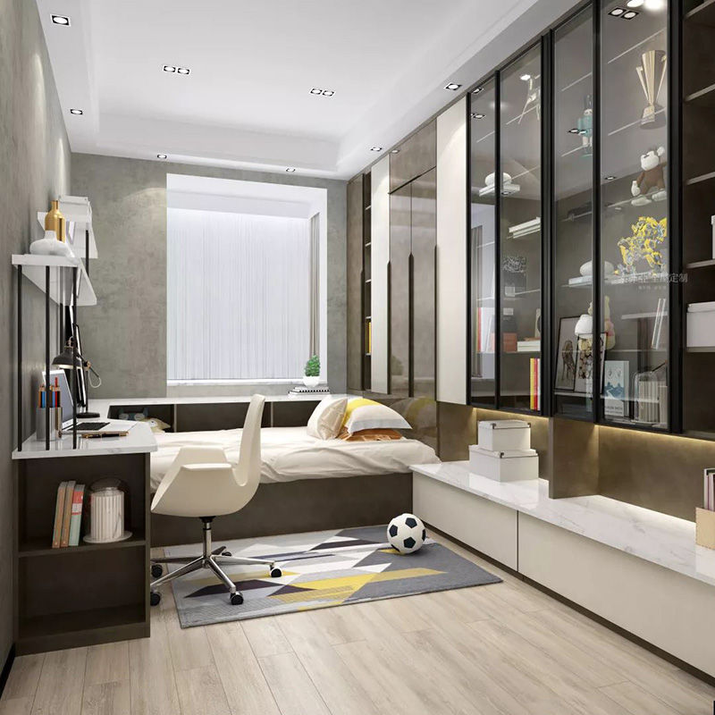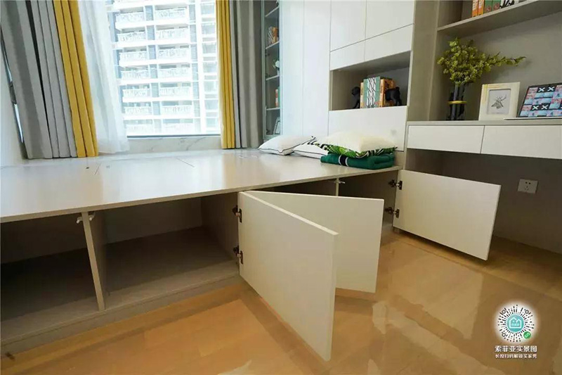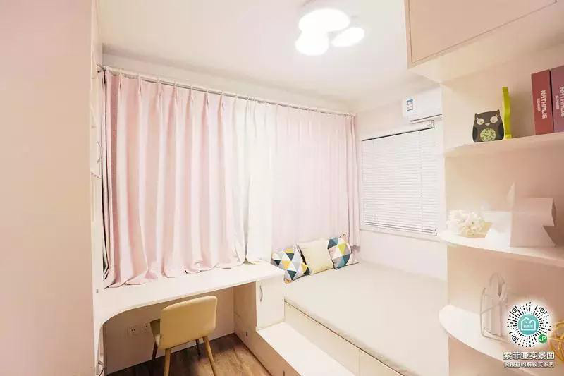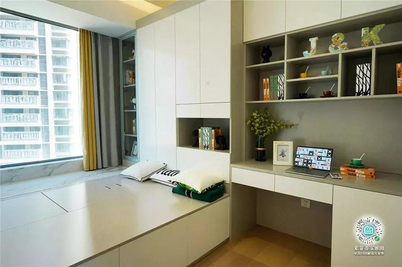 考慮到孩子未來學習空間,這種“榻榻米床+儲物櫃+工作桌”是最為實用的布局,就算臥室小于7㎡,也可以輕松打造。