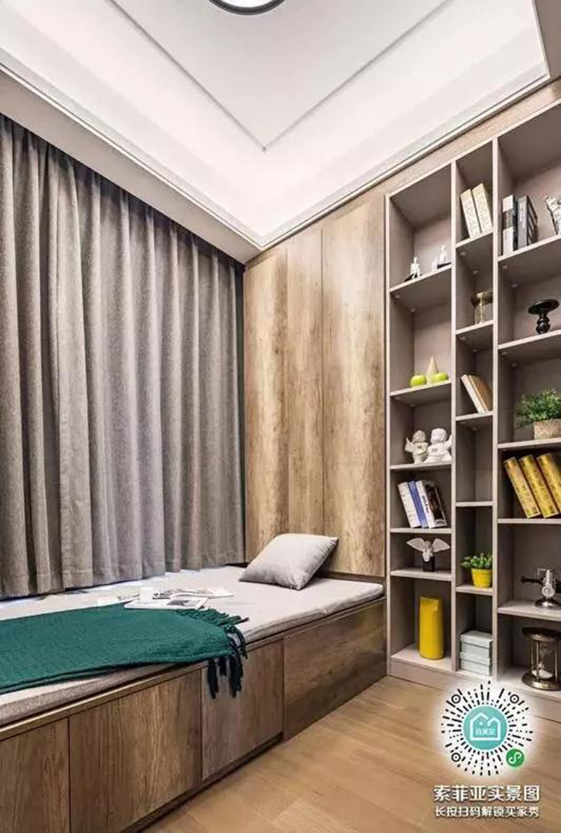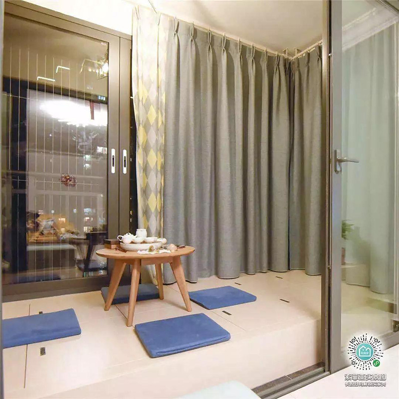 陽臺有一個大大的落地窗,在下面設計榻榻米地臺,若能裝上玻璃隔斷(最好是透光不透影的)就更好了,既能保證室內採光,還能給居住者足夠的隱私空間。