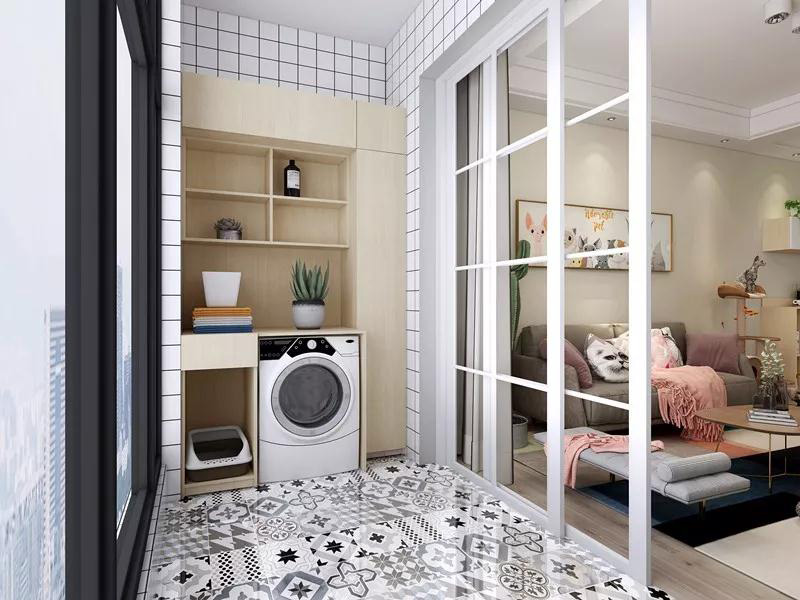陽臺一側立面打造個洗衣區,儲物頂櫃放洗滌用品,臺面放臟衣簍,臺下留出1㎡的位置嵌入洗衣機,洗衣晾衣,動線最短。