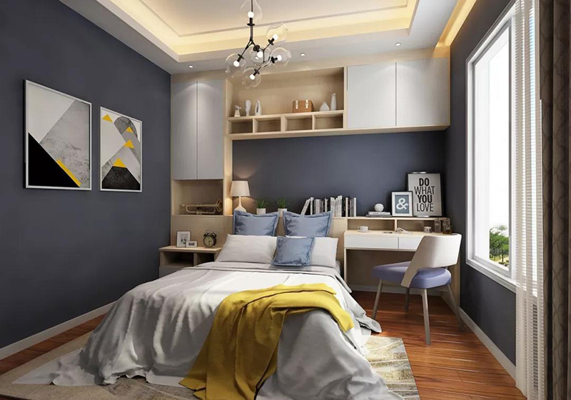 如果床頭只用來擺放兩個小床頭櫃就太可惜了,其實床頭那一面墻可以拿來做收納、展示甚至是隱藏起一張床。