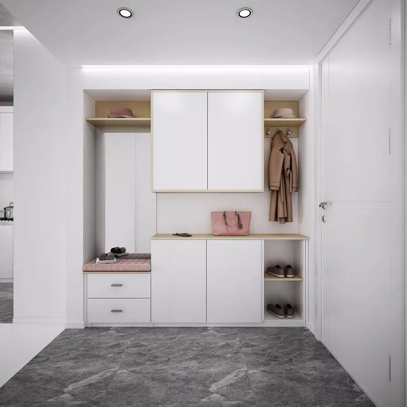 除了利用好墻面空間,有轉角位的戶型,也要好好利用起來。裝個換鞋凳,層板里還可以多放4-6雙鞋子。