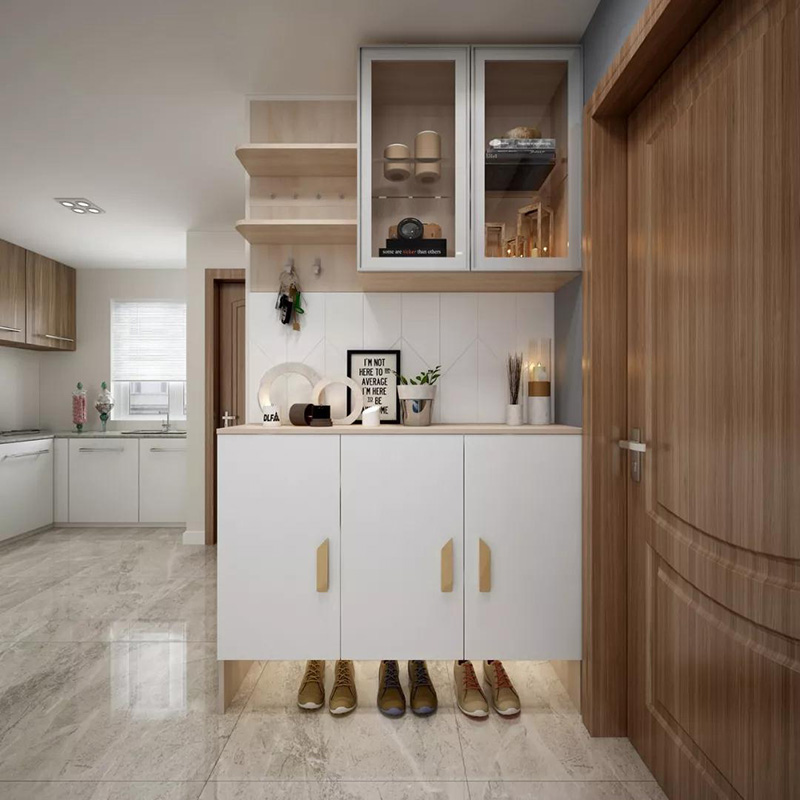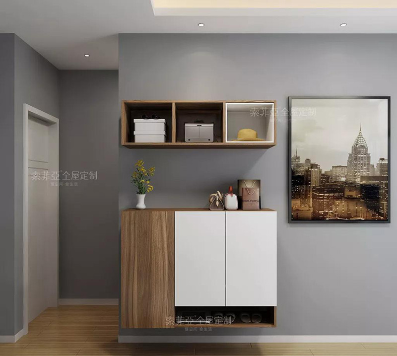 戶型小玄關窄,很多人第一反應就是選擇放一個矮鞋櫃,滿足基本的鞋子收納。其實,可以挖掘鞋櫃上方的墻面空間,增加收納儲物的可能性。