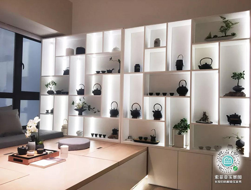 榻榻米搭配升降臺,如果兩側還有空間,可以打造一些櫃體做收納,再備茶具和甜點,頓時就將整個空間打造成一個坐臥一體的小茶室,成為繼客廳之外另一個用來招待客人的好去處,太別致了。