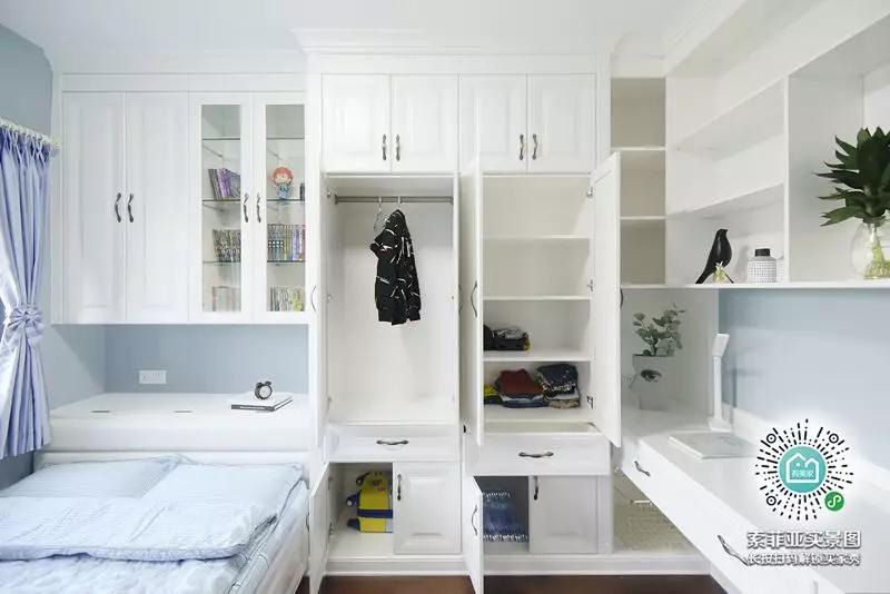 這個組合特別適合小戶型小房間的伙伴們,一起床伸手就能拿到衣服,睡前看完書隨手放到書櫃上,動線流暢,日常起居方便。